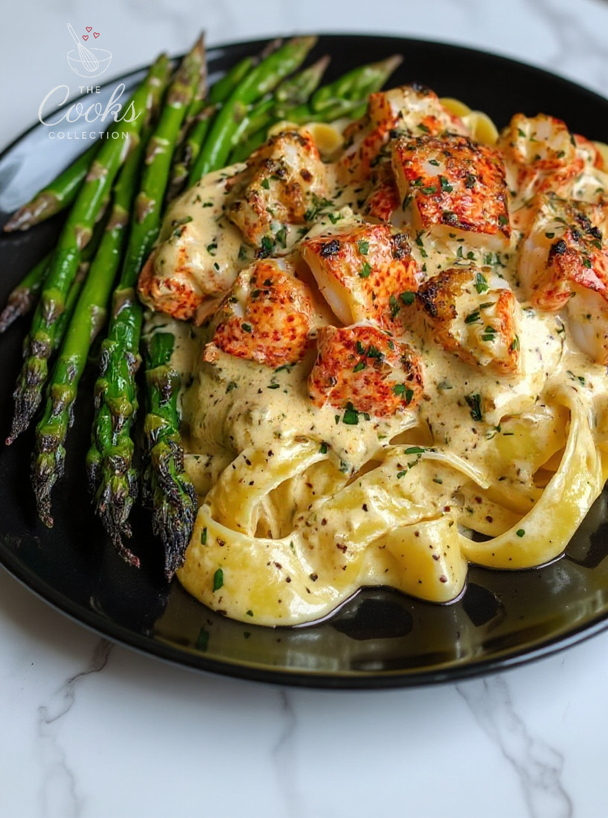 To keep the lobster delicate and juicy, we gently poach it in seasoned butter (a quick, controlled stovetop method). The pan becomes liquid gold for building the sauce: shallot, garlic, a whisper of white wine (optional but lovely), cream, and freshly grated Parmesan emulsify into a glossy coating that clings to every strand of pasta. A squeeze of lemon and a shower of herbs sharpen the finish without masking the natural sweetness of the lobster. Serve it piled high with charred asparagus spears for contrast and color, and you’ve got an elegant dinner that’s effortless to love.